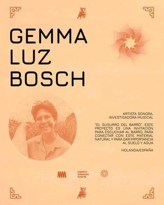 Gemma Luz Bosch, artista sonora e investigadora musical de origen Holanda/España, quien desarrolla este proyecto como una invitación a escuchar al barro, a reconocer su fuerza como material natural y a resaltar la importancia del suelo y el agua.