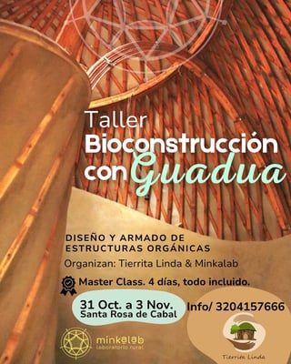 El taller se realizará en Minkalab, un laboratorio vivo de bioconstrucción, arte, tecnología y saberes ancestrales con más de 12 años de trayectoria. Ubicado en las montañas de Risaralda, a pocos kilómetros de Pereira y Manizales, ofrece un entorno natural ideal para el aprendizaje práctico, el disfrute del territorio y la vida sostenible en comunidad.