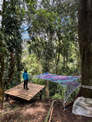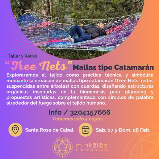 En MinkaLab nos reunimos para tejer con cuerdas y con vínculos. Durante dos días exploraremos el tejido como práctica técnica y simbólica, creando Tree Nets — redes suspendidas entre árboles — y